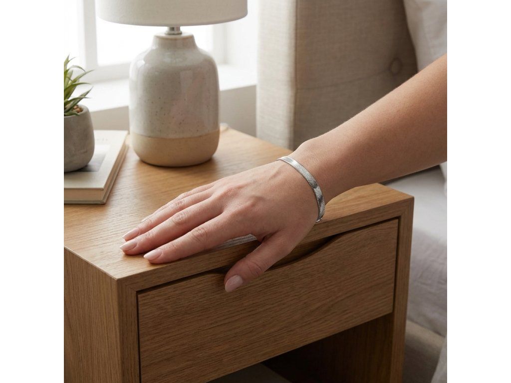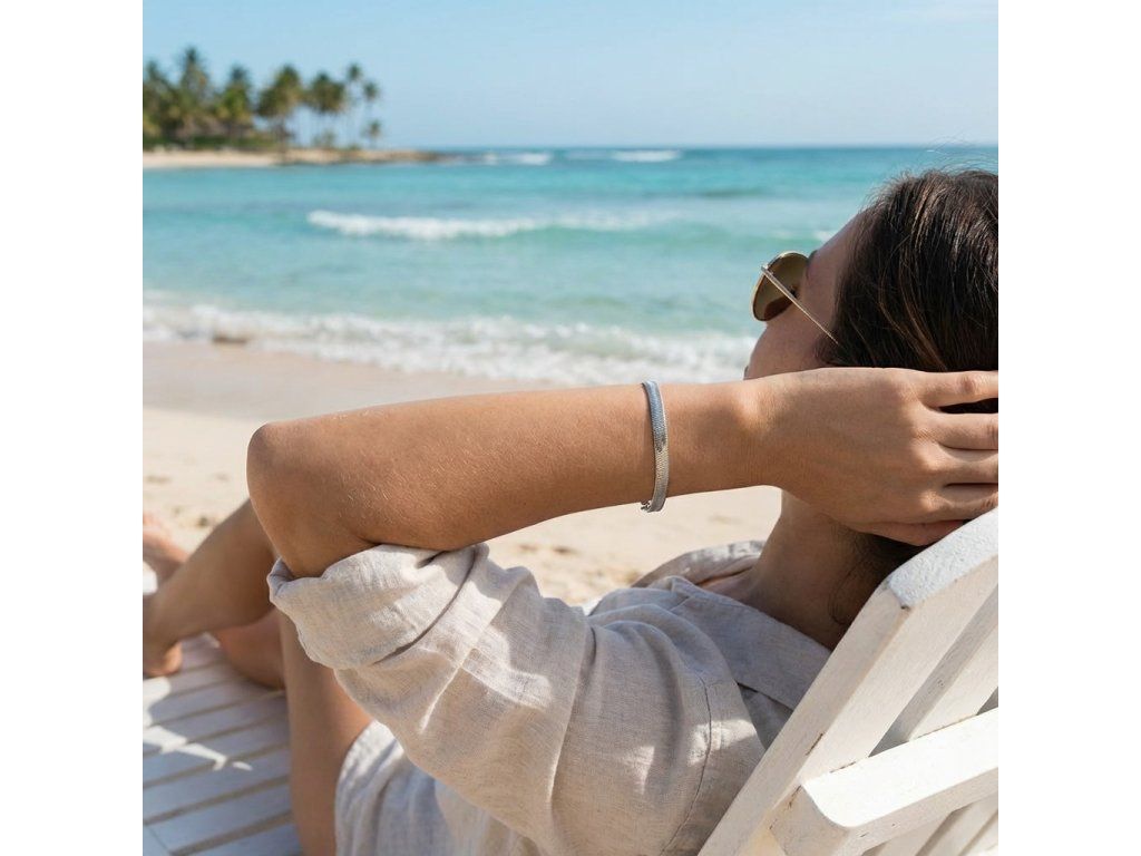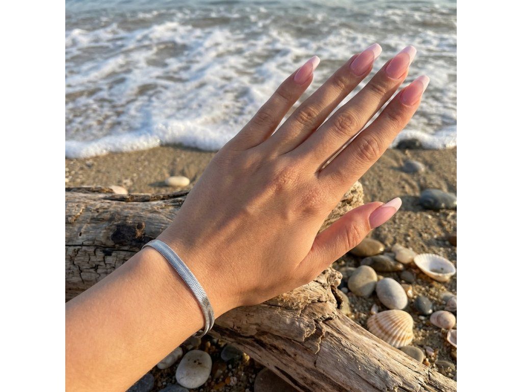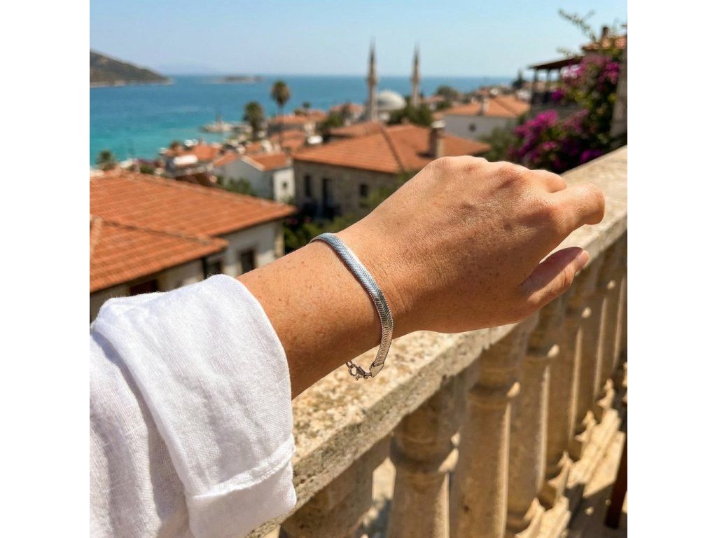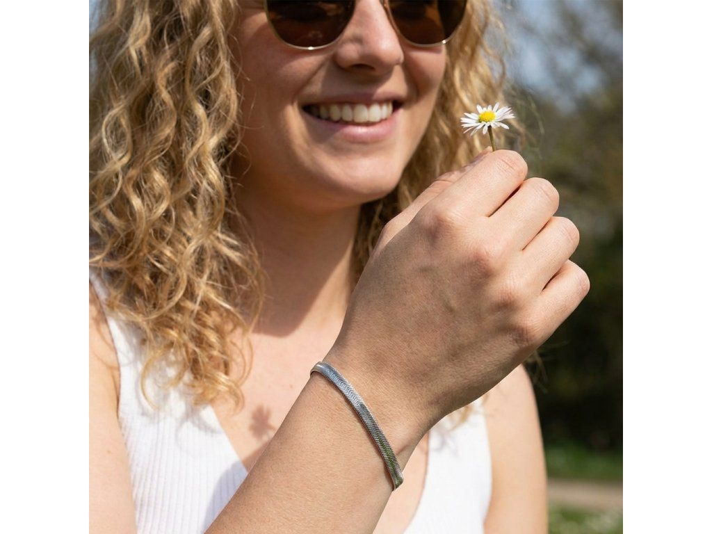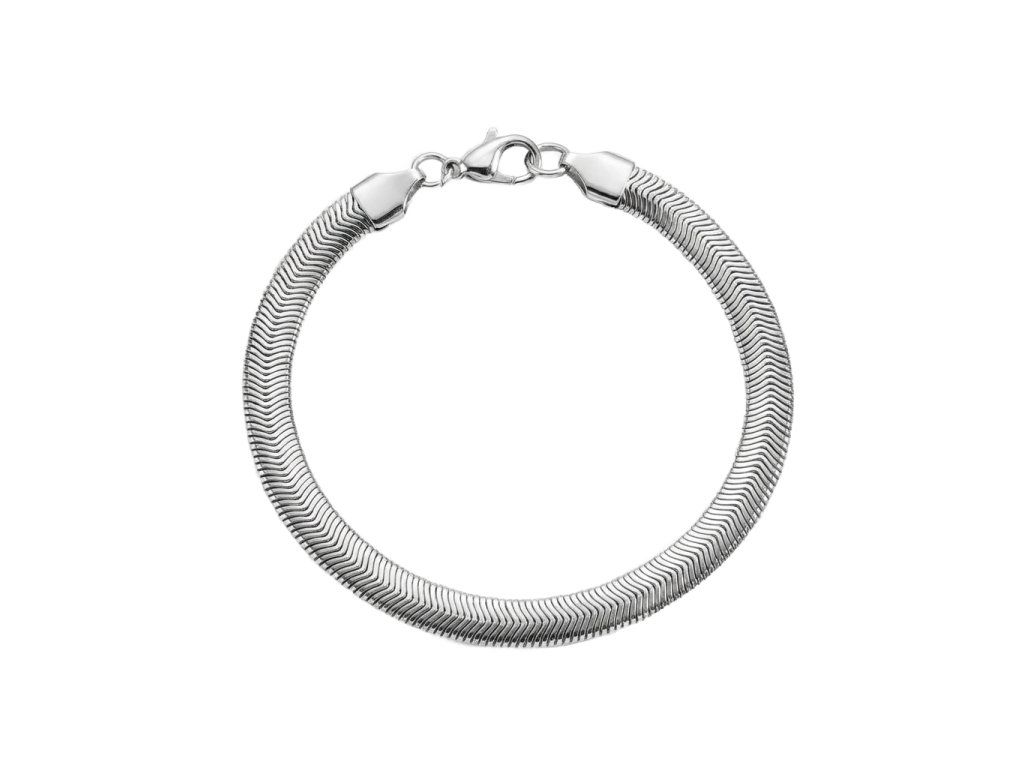 Hladký plochy náramok z chirurgickej ocele. Dĺžka 19 cm, šírka 0,6 cm.