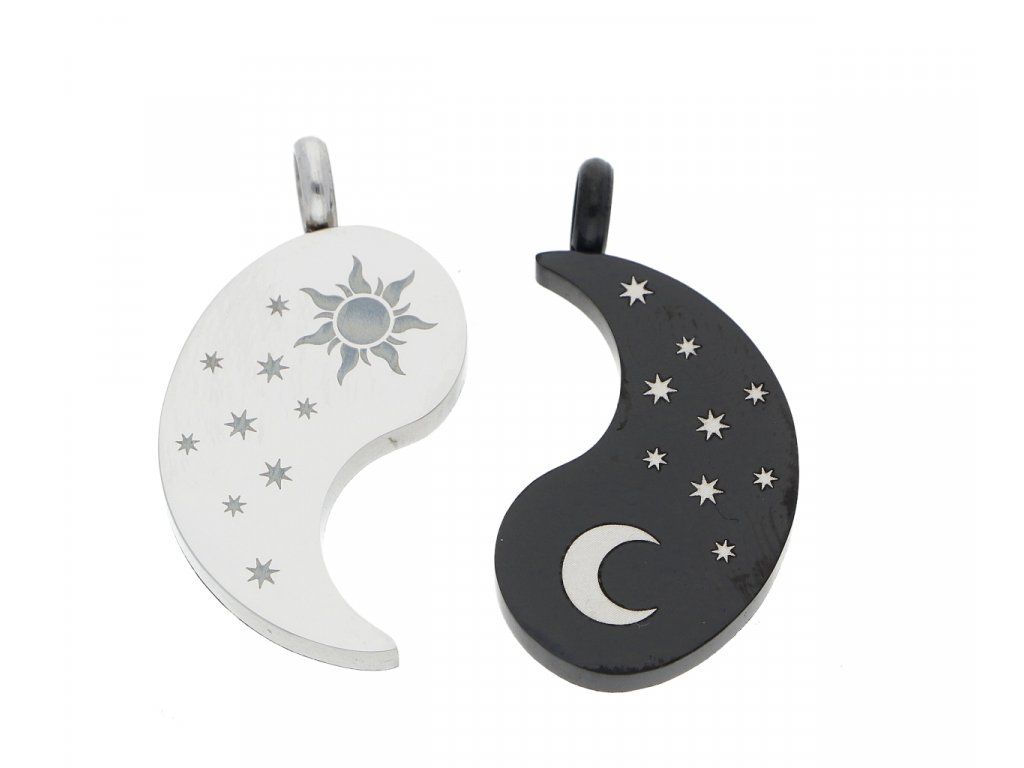 Oceľové prívesky pre dvoch Tai chi alebo JIn Jang ktorý symbolizuje dve navzájom opačné a doplňujúce sa sily, takže asi sa v tom veľa z nás nájde už len premyslieť ktorú polovicu dostane partner. Priemer spojených prívesku je 2,5 cm.