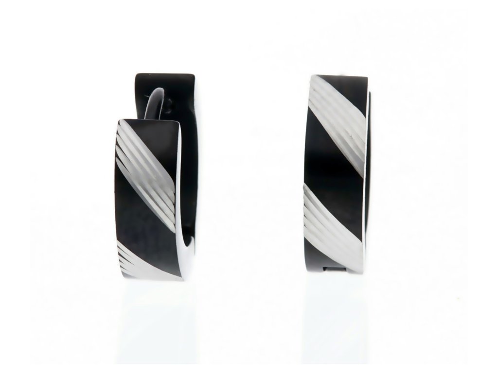 Náušnice chirurgická oceľ Ø13 mm. Chirurgická oceľ je obľúbeným kovom, ktorý nespôsobuje alergie. Preto sa z neho vyrába mnoho módnych doplnkov a šperkov. . Vhodné pre deti i dospelých. Rozmer: vonkajší priemer 13 mm, šírka 4 mm. Náušnice majú oceľový základ v čiernej farbe a predná strana má dva strieborné prúžky. Darčekové balenie.