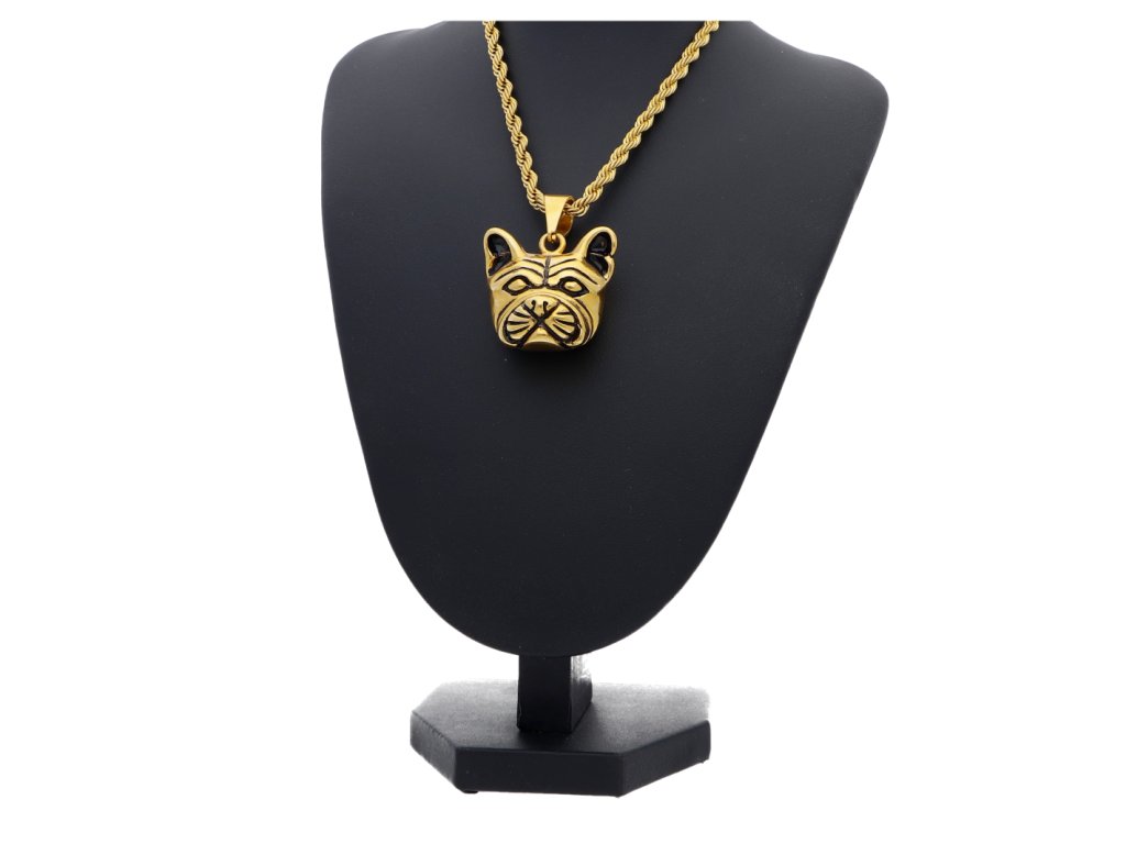 PRÍVESOK BULDOG z chirurgickej ocele s retiazkou v zlatej farbe. Výška prívesku 3,3cm, šírka 3cm, hr. 0,2cm, priemer očka 0,8 cm. Retiazka rozmery dĺžka 50 cm, hrúbka retiazok 3,2 mm.