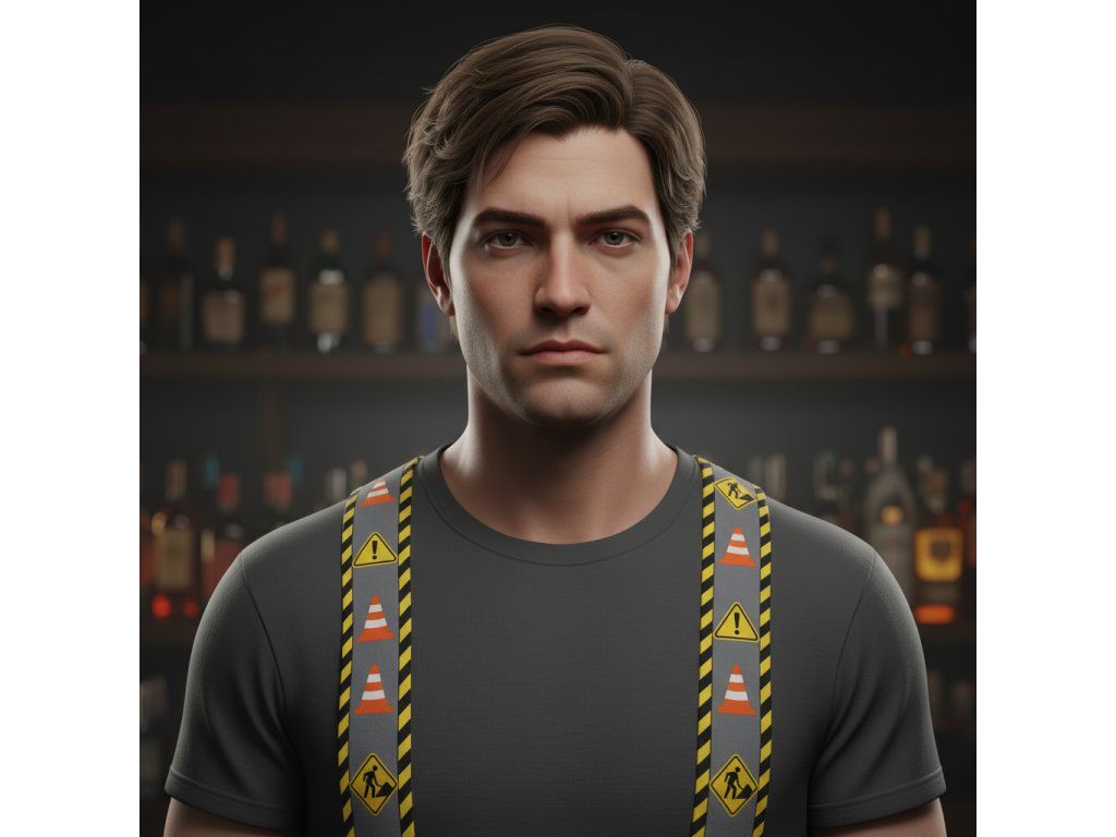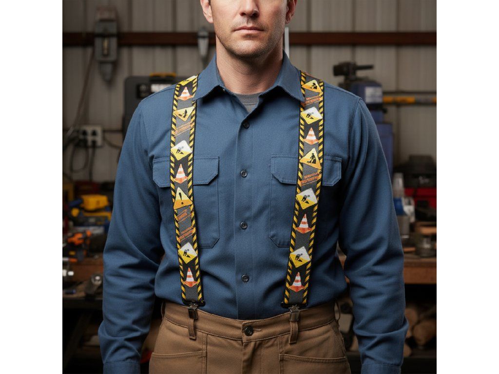Traky majú kožený stred a k nohaviciam ich uchytíte pomocou kovových klipov. Pánske traky sú veľmi obľúbené ako k pracovným nohaviciam tak aj do spoločnosti. S týmto motívom výstažného značenia. Traky majú dĺžku 120 cm v nenapnutom stave, šírka 5 cm, ľahký systém nastavenia dĺžky. materiál: 65% polyesterové vlákna, 25% latex, hovädzia koža, barex, kov bez niklu.