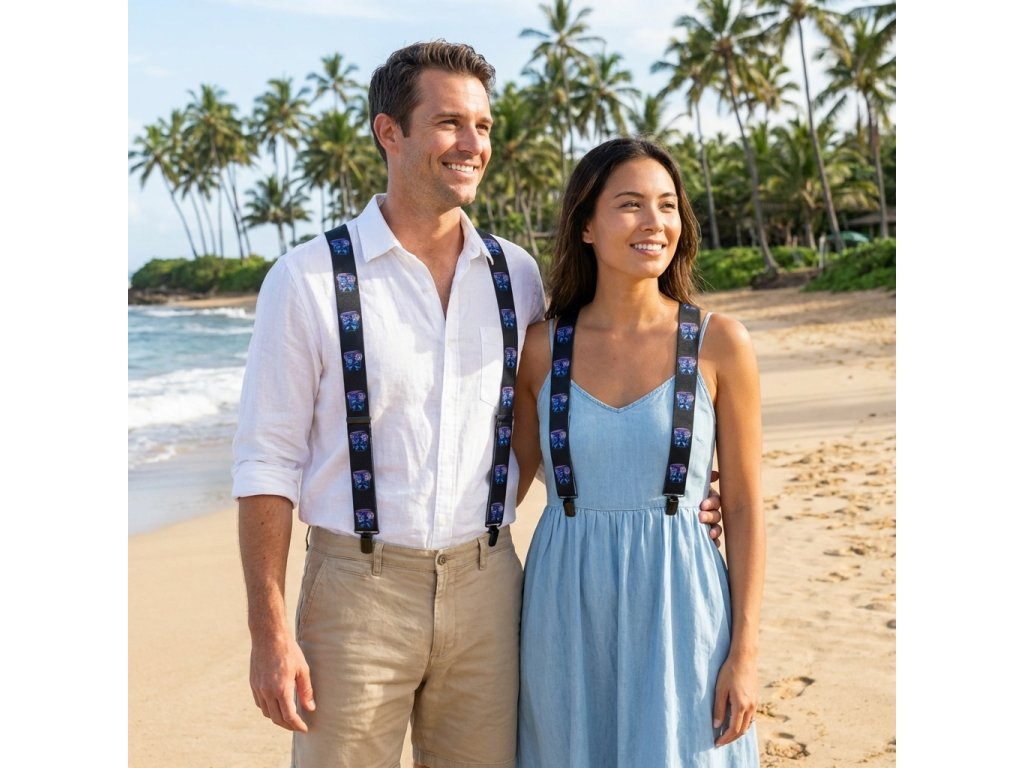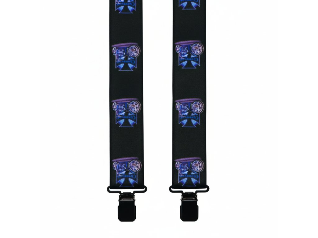 Traky - šírka 5 CM. Traky s potlačou - Lebka 2 Kvalitné a pohodlné traky (traky) vo vzore "Y" s potlačou, šírka 5 cm, minimálna dĺžka 120cm (roztiahnuť možno až na 150cm), uchytenie kvalitnými kovovými klipsami.Materiál: polyester Možnosť ručného prania do 40 ° C. Možnosť nastavenia Jednoduchý systém nastavenia dĺžky.