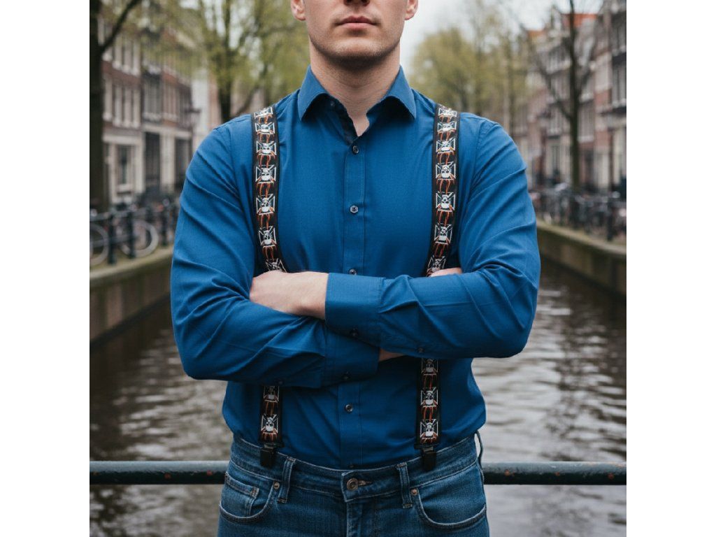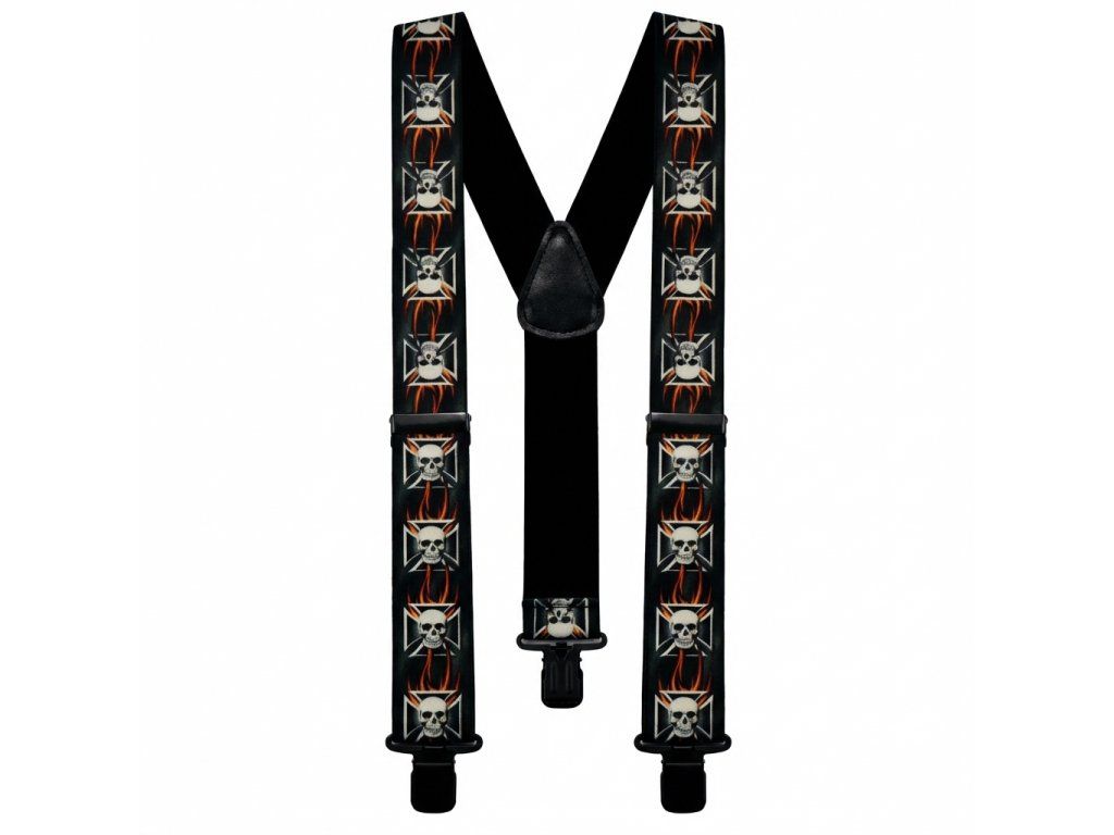 Traky - šírka 5 cm. Traky s potlačou - Lebka 2 Kvalitné a pohodlné traky (traky) vo vzore "Y" s potlačou. Šírka 5 cm minimálna dĺžka 120cm (roztiahnuť možno až na 150cm), uchytenie kvalitnými kovovými klipsami Materiál: polyester Možnosť ručného prania do 40 ° C. Možnosť nastavenia Jednoduchý systém nastavenia dĺžky.